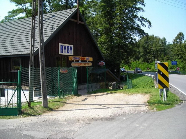 Po około 3 km wjeżdzamy (kierując się drogą z pierwszeństwem - czyli w zasadzie cały czas prosto) do Fryszerki, zwalniamy ostro na zakręcię prawostronnym (uwaga policja) i tuż za nim po prawej stronie mamy smażalnie rybek (zdjęcie nr 1).